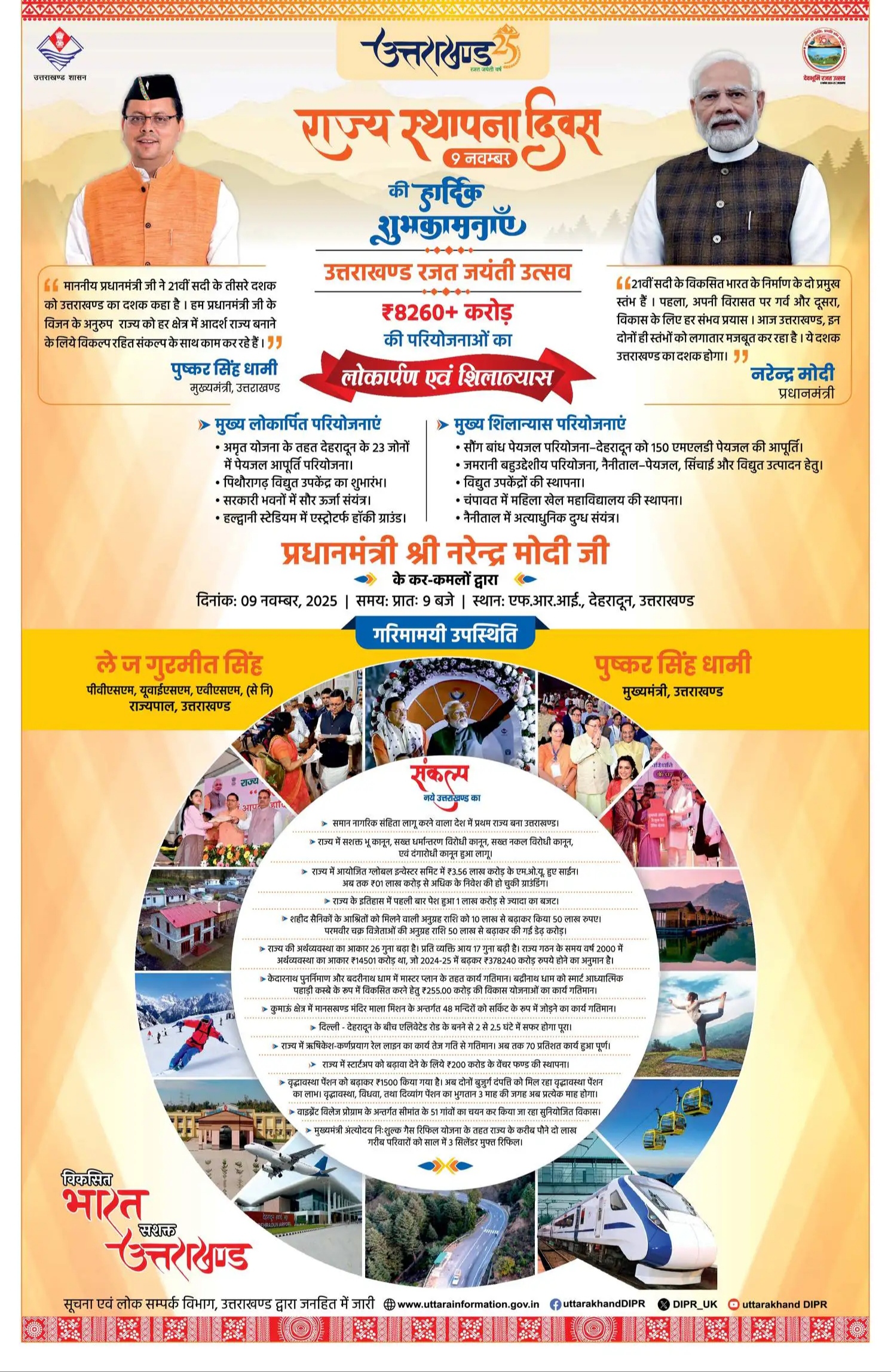 21वीं सदी के विकसित भारत के निर्माण के दो प्रमुख स्तंभ हैं। पहला, अपनी विरासत पर गर्व और दूसरा, विकास के लिए हर संभव प्रयास। आज उत्तराखण्ड, इन दोनों ही स्तंभों को लगातार मजबूत कर रहा है। ये दशक उत्तराखण्ड का दशक होगा।”